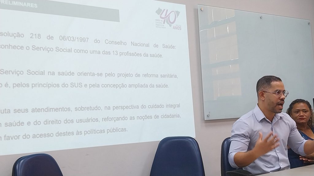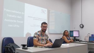 No segundo momento, o assistente social e professor Japson Gonçalves apresentou uma reflexão sobre os parâmetros de atuação da/do assistente social, ressaltando a correlação entre as atribuições desenvolvidas pelas profissionais na UPAs e do Código de Ética da profissão.