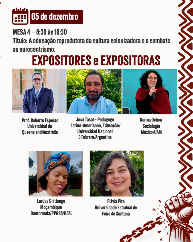 #DescriçãodaImagem: card 1 com fundo vinho e detalhes em branco. Acima, há as logos da realização do evento, seguido do título da atividade. Abaixo, há a ilustração de pessoas negras e indígenas com punho erguido e uma faixa com a frase Mesas 4, 5, 6 e 7. Nos demais cards, há as imagens, nomes e títulos das/dos palestrantes da atividade, sobrepostas a uma forma quadrada.