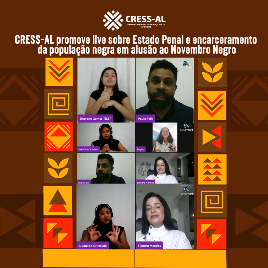 Em alusão ao Novembro Negro, o CRESS Alagoas realizou no dia 19 de novembro a live “O Estado Penal e o Encarceramento da População Negra no Brasil”, iniciativa do Comitê de Combate ao Racismo e da Comissão de Ética e Direitos Humanos. O debate contou com a participação do Professor Paulo Félix, assistente social, advogado e docente da UFS, e da Professora Silmara Mendes, assistente social, doutora em Serviço Social e docente da UFAL. A discussão se concentrou na análise das desigualdades raciais dentro do sistema prisional brasileiro, apontando o racismo estrutural como elemento central desse fenômeno.