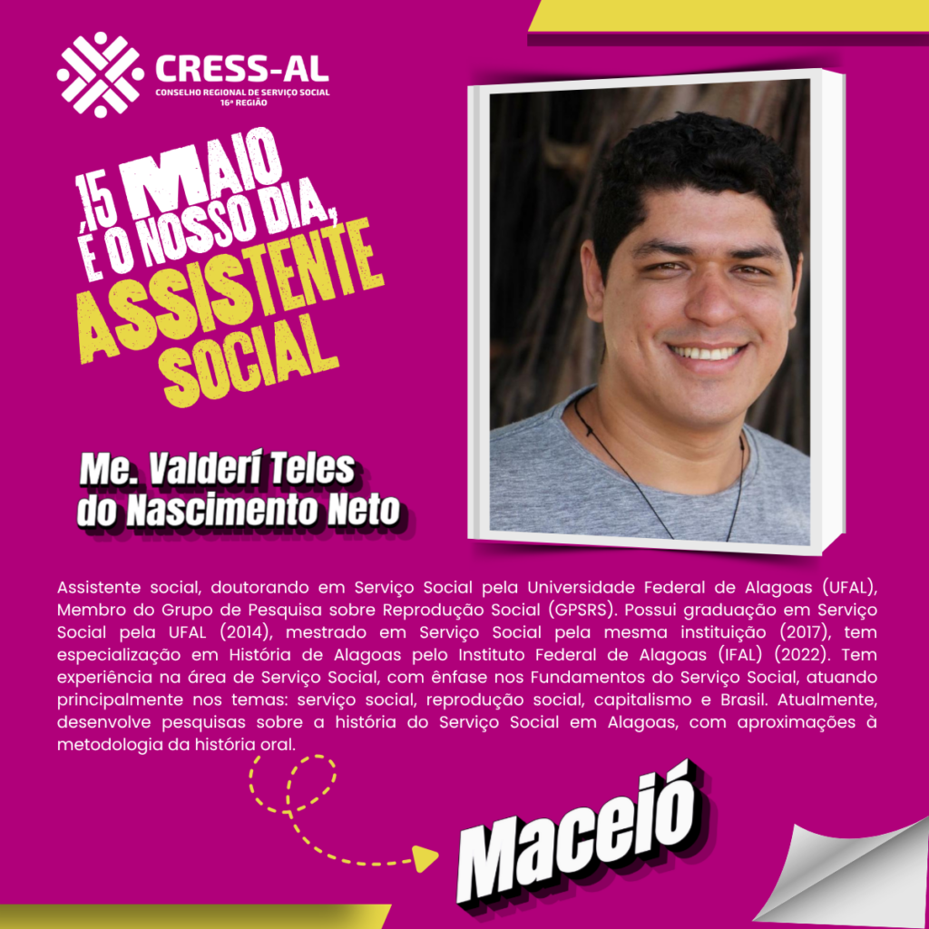 Em comemoração ao Dia da/do Assistente Social, o Conselho Regional de Serviço Social – 16ª Região (CRESS-AL) realiza, no dia 15 de maio, uma programação especial em Maceió, reunindo a categoria para um momento de reflexão crítica, fortalecimento profissional e reafirmação do compromisso com a defesa de direitos.