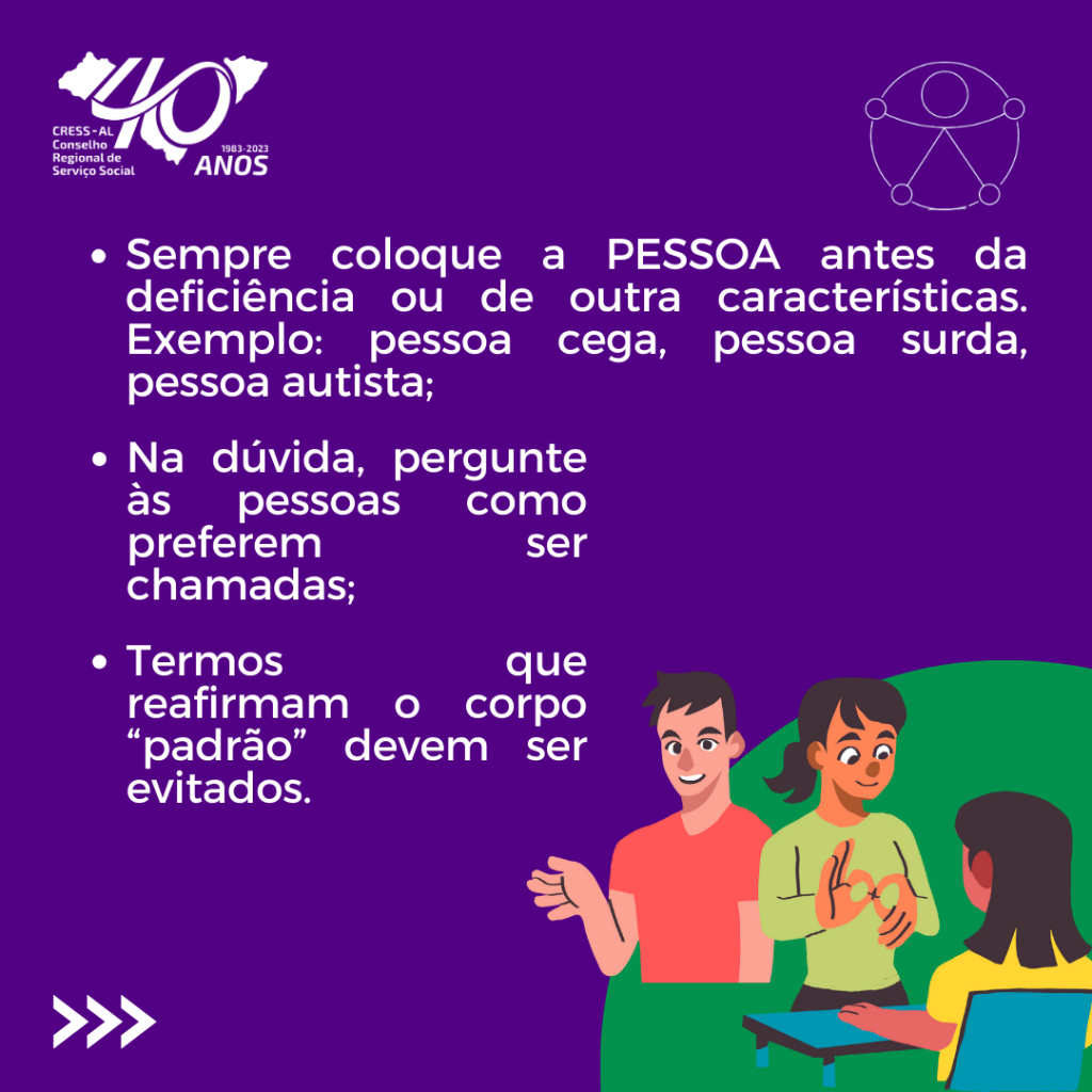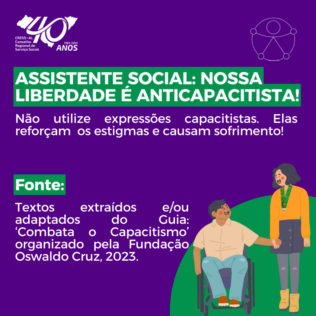 #DescriçãodaImagem: 6 cards com fundo roxo, detalhes em verde, logo dos 40 anos do CRESS-AL. Há ainda ilustrações coloridas que retratam pessoas com deficiência e textos relacionados ao tema da matéria.