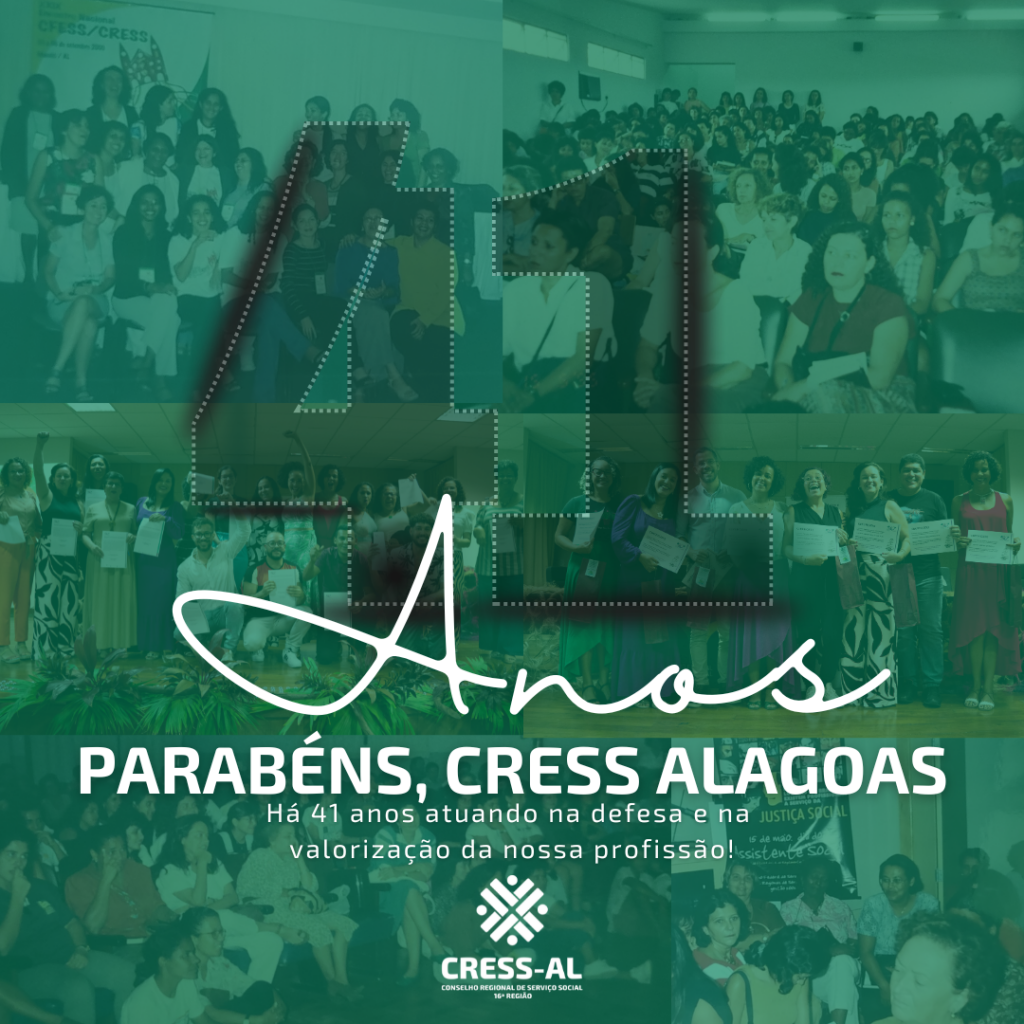 Há 41 anos, celebrado no dia 16/09, o Conselho Regional de Serviço Social de Alagoas (CRESS-AL) tem sido um pilar fundamental na defesa e valorização da nossa profissão. Nessa trajetória de lutas, conquistas e existência, o CRESS-AL tem atuado de forma incansável para garantir os direitos das/os assistentes sociais. Cada ano representa um avanço na busca por melhores condições de trabalho, formação e fortalecimento da nossa categoria.
