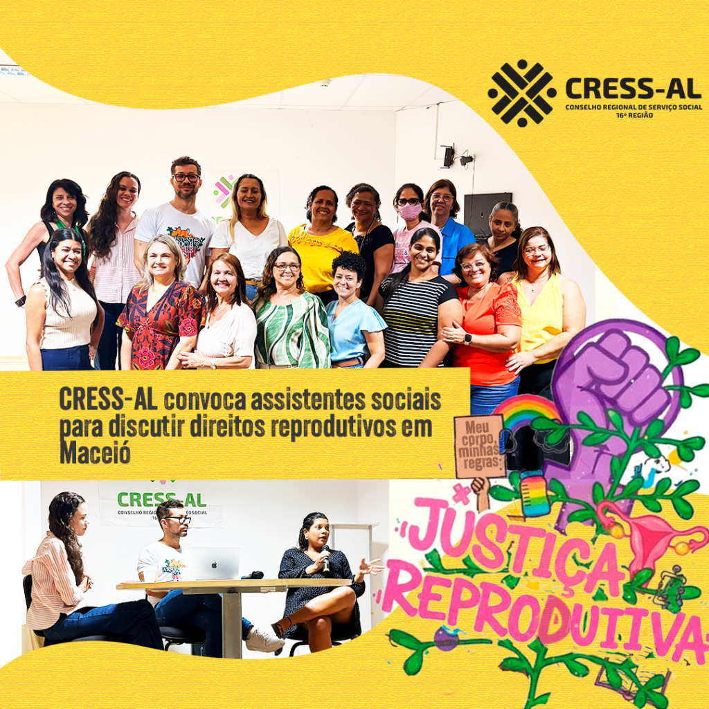 #DescriçãodaImagem: card com fundo amarelo, logo do CRESS-AL, ilustração colorida com a frase Justiça Reprodutiva e duas imagens da atividade: uma com o grupo de participantes e a outra com Yasmin, Everton e Kyvia.