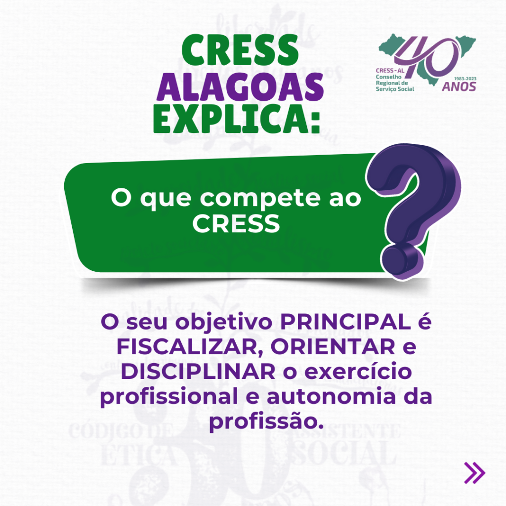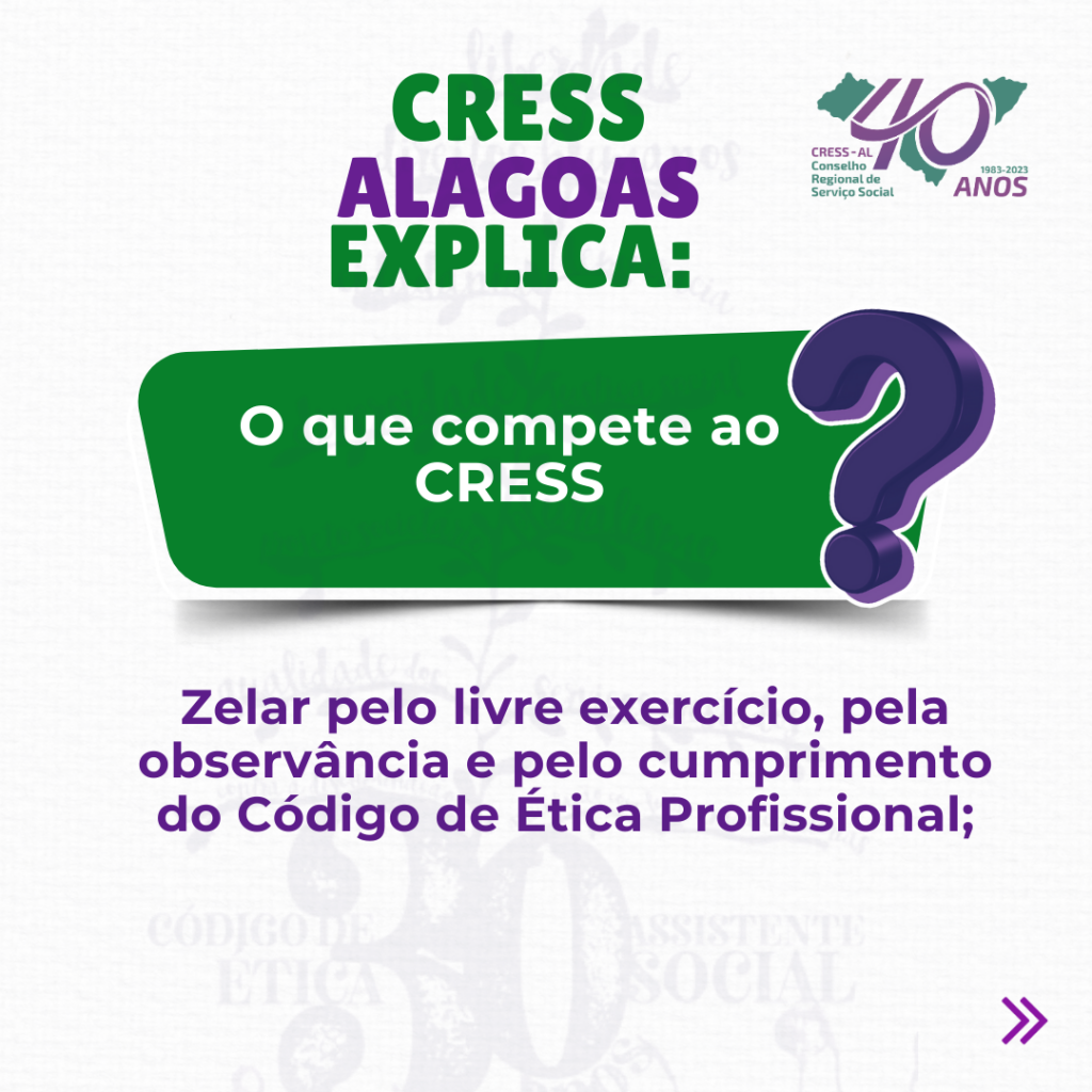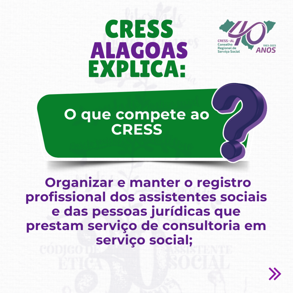 Outrossim, juntamente com o Conselho Federal e demais Conselhos Regionais de Serviço Social, compõe o conjunto CFESS/CRESS desenvolvendo ações para além de um órgão regulador do exercício profissional. As atividades estabelecidas refletem a luta cotidiana em defesa da categoria e da qualidade dos serviços prestados por assistentes sociais à população usuária.