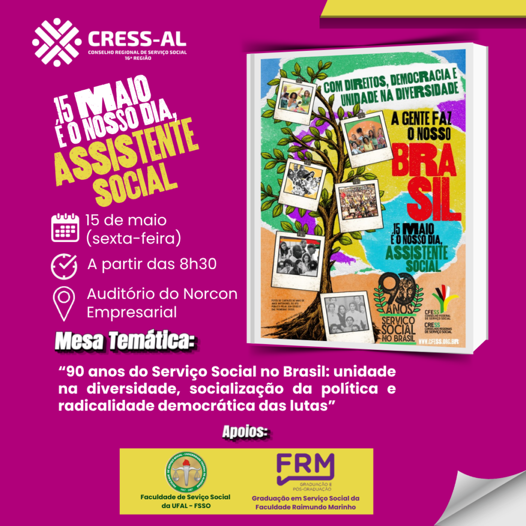 Em comemoração ao Dia da/do Assistente Social, o Conselho Regional de Serviço Social – 16ª Região (CRESS-AL) realiza, no dia 15 de maio, uma programação especial em Maceió, reunindo a categoria para um momento de reflexão crítica, fortalecimento profissional e reafirmação do compromisso com a defesa de direitos.