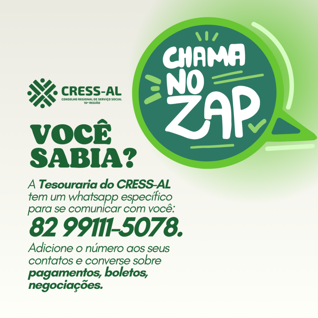 #DescriçãodaImagem: card com fundo bege, logo do CRESS-AL e uma ilustração em círculo com a frase: chama no zap. Do lado esquerdo há o texto com informações sobre o número do whatsapp da tesouraria.